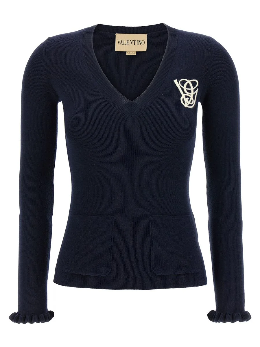 Valentino Garavani wool sweater with dense weave, front logo embroidery, V-neck, front pockets, long sleeves with ruffles on the cuffs Gender: Women Material: 100% VIRGIN WOOL Color: BLUE Made in: Italy Product ID: B3KC67I9H7BBE *Import tax/duty will be calculated at checkout (If applicable)