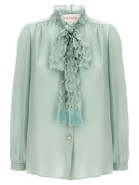 Silk crepe de Chine shirt with lavalliere collar, ruffled sash and fringes on the hem, jewel button closure, long cuffed sleeves Gender: Women Material: 100% SILK Color: GREEN Made in: IT Product ID: B3AB77590FR5F *Import tax/duty will be calculated at checkout (If applicable)