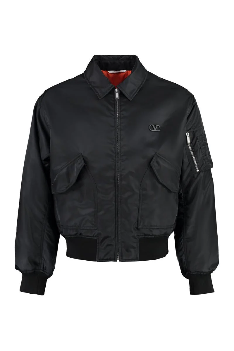 Nylon bomber jacket Zipped pocket on the left sleeve Pen pocket on left sleeve Shirt style collar Ribbed cuffs and lower edge Padding: 100% polyester 100% Polyamide, 90% Cotton, 8% Polyamide, 2% Elastane Gender: MEN Material: POLYAMIDE Color: BLACK Made in: IT Product ID: 3V3CIM979F7_0NA *Import tax/duty will be calculated at checkout (If applicable)