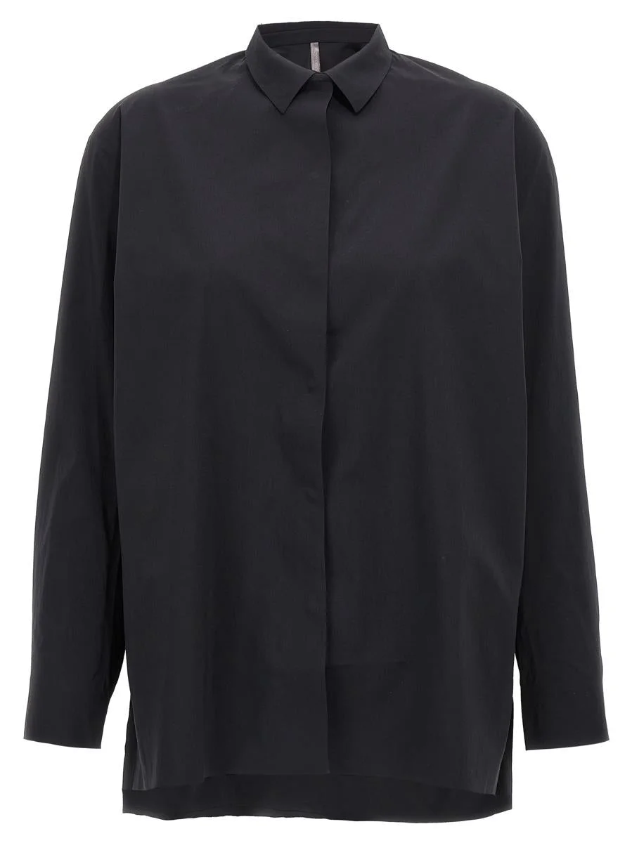 'Diene' stretch nylon shirt with ultrasonic welding, front snap button closure, long cuffed sleeves, side slits Gender: Women Material: 93% NYLON, 7% ELASTANE Color: Black Made in: Imported Product ID: X000009315BLACK *Import tax/duty will be calculated at checkout (If applicable)