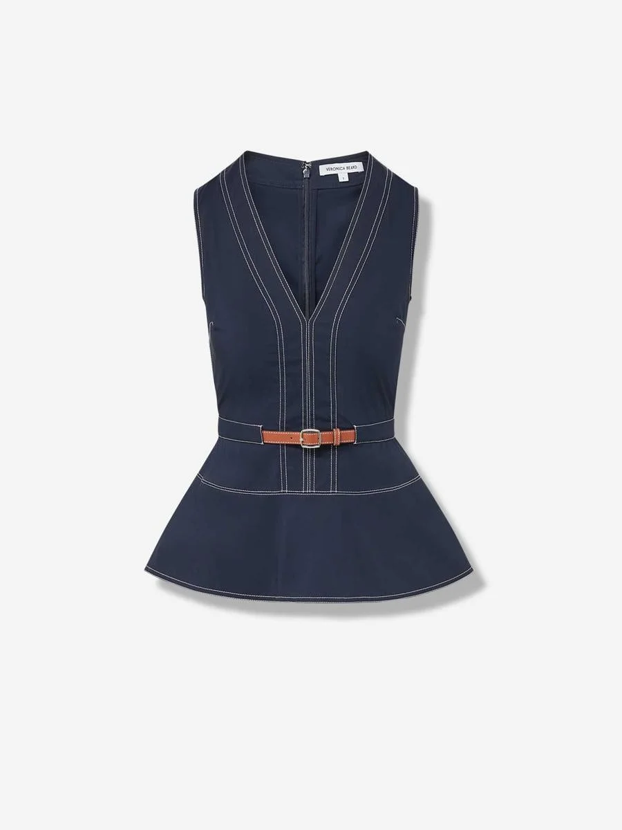 Nickleby Belted TopTop By Veronica Beard• Finished with white stitching details• Peplum style hem• Loose fit for an elegant and relaxed style• Built-in belt that cinches the waist• Crafted from a premium stretch cotton blend• Sleeveless top• Closure with hidden back zipper• V-neckComposition: 67% Cotton, 30% Polyamide, 3% ElastaneMade in: Italy Gender: Women Material: 67% COTTON, 30% POLYAMIDE, 3% ELASTANE Color: MIDNIGHT BLUE Made in: Italy Product ID: 2507LSCP41287_W0006NAVY *Import tax/duty will be calculated at checkout (If applicable)