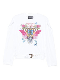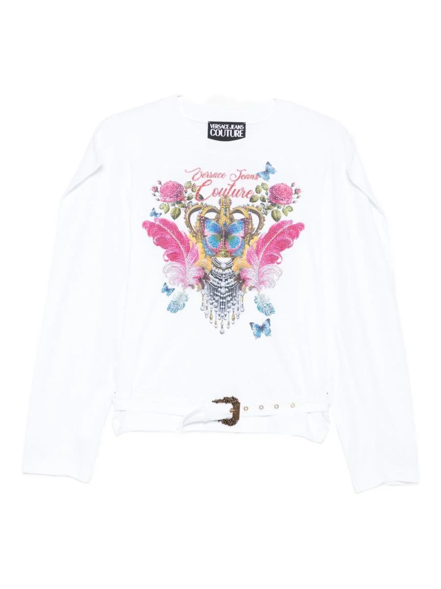 Versace Jeans Couture Embellished Top Features White crown decoration Butterfly motif Feather detail Encrusted design Knotted belt Composition 100% cotton Gender: Women Color: WHITE Made in: Italy Product ID: 79HAHE03CJ01E003 *Import tax/duty will be calculated at checkout (If applicable)