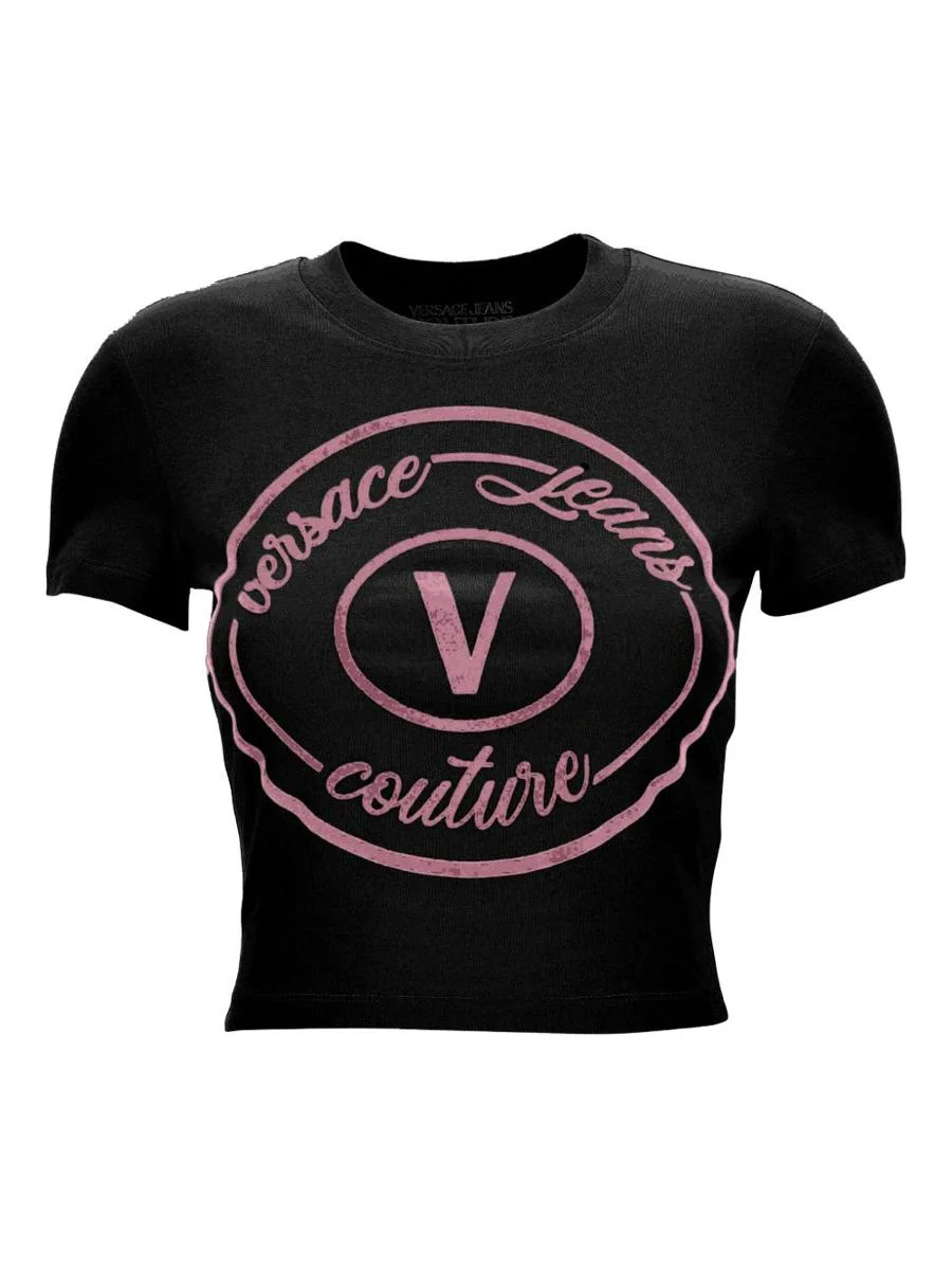 Versace Jeans Couture T-shirt with applique Features Black short sleeves Circular pattern Central V-shaped motif Black logo Cotton Composition 100% cotton Gender: Women Color: Black Made in: Italy Product ID: 79HAHE04CJ02E899 *Import tax/duty will be calculated at checkout (If applicable)