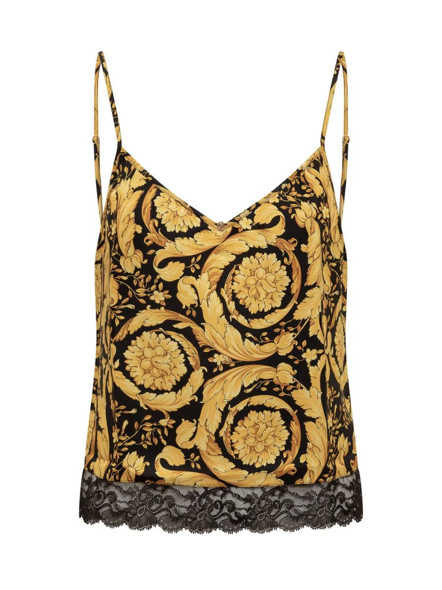 Silk underwear tank top. Thin straps. Bottom with black lace. Medusa detail on the front. Baroque all-over print. Gender: WOMEN Material: 100% SILK - 100% POLYAMIDE Color: YELLOW Made in: IT Product ID: 10085571A06155 5B000 *Import tax/duty will be calculated at checkout (If applicable)