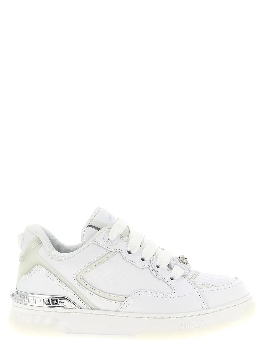 'Biggie Basket' leather sneakers with high frequency Greca motifs, lace-up closure with 'Medusa Biggie' detail, back metal hardware, rubber sole Gender: Women Material: 100% CALFSKIN LEATHER (BOS TAURUS) Color: WHITE Made in: Imported Product ID: 10205381A146152WY4P *Import tax/duty will be calculated at checkout (If applicable)