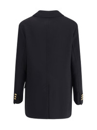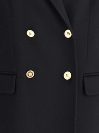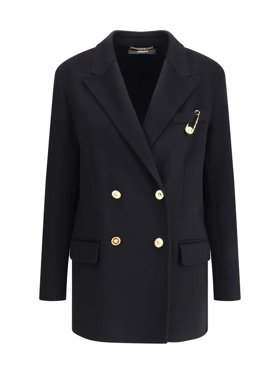 VERSACE'S WOOL AND CASHMERE BLEND DOUBLE-BREASTED COAT COMBINES SARTORIAL ELEGANCE WITH ICONIC DETAILS. THE PEAKED LAPELS, LONG SLEEVES AND FRONT PATCH POCKETS ENHANCE THE CLASSIC LINES OF THE GARMENT, WHILE THE SAFETY PIN ACCESSORY AND MEDUSA BUTTONS LEND DISTINCTIVE CHARACTER. BUTTONED CUFFS AND A BACK SLIT COMPLETE THE DESIGN. RTW IT Gender: Women Material: KASHMIR/CAPRA HIRCUS | WOOL Color: Black Made in: Italy Product ID: 10209711A15400_1B000 *Import tax/duty will be calculated at checkout (If applicable)