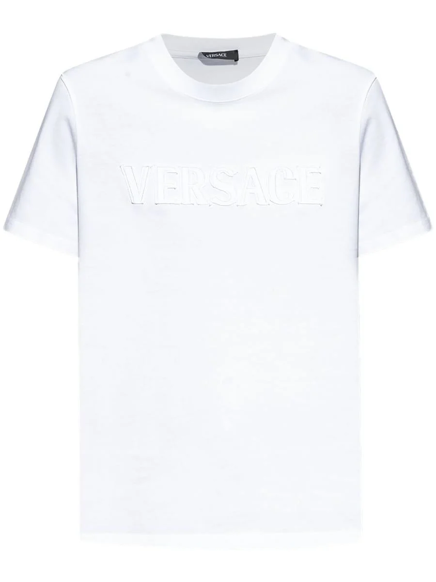 Versace Fringed Logo T-Shirt Clothing Gender: Women Material: COTTON | 100% COTTON Color: WHITE Made in: IT Product ID: 1018981/1A13616_1000 *Import tax/duty will be calculated at checkout (If applicable)