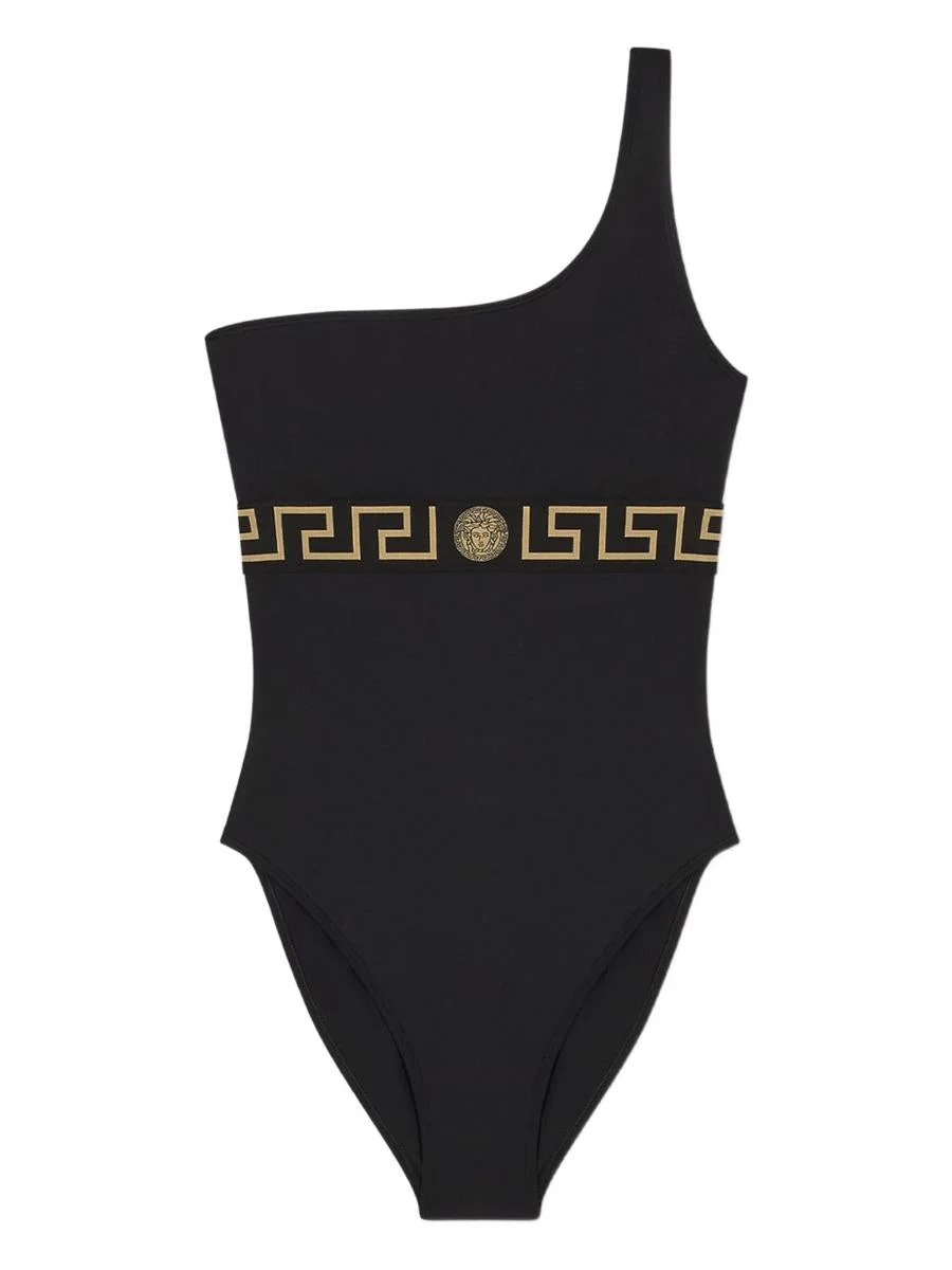 black signature Greca detailing single shoulder strap high-cut leg fitted design Be mindful to try on swimwear over your own garments. This piece fits true to size. We recommend you get your regular size Model is 1,75m / 5ft 8in wearing size 1 (NUM) Gender: Women Material: 1.OUTER FABRIC:22% ELASTANE, 78% NYLON;LINING 1:22% ELASTANE, 78% NYLON;TRIM:9% ELASTANE, 9% NYLON, 82% POLYESTER Color: Black Made in: Italy Product ID: 10204881A111191B000 *Import tax/duty will be calculated at checkout (If applicable)