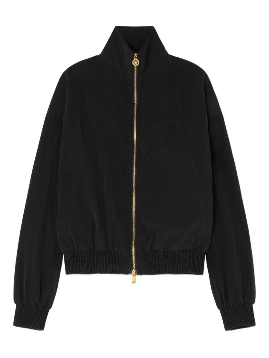 Two-way zip front closure; Medusa Biggie zip puller Ribbed stand-up collar, hem, and cuffs Tone-on-tone VERSACE logo embroidery on the chest Side pockets with snap buttons Wild Cats print lining Regular fit Color: Black Outer: 100% Polyamide; Lining 1: 100% Polyester; Lining 2: 100% Cotton Made in Italy Gender: Men Material: 100% POLYAMIDE Color: Black Made in: Italy Product ID: 10215481A157951B000 *Import tax/duty will be calculated at checkout (If applicable)