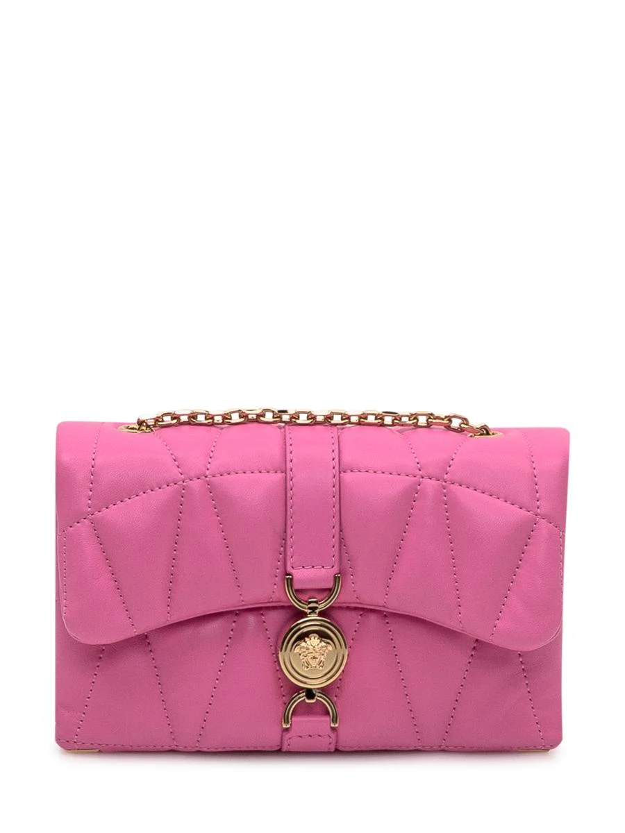 Pink leather bag. Adjustable and removable shoulder strap. Two compartments and inside pocket. Magnetic button closure with Medusa logo. Width: 18 Height: 10 Depth: 6 Gender: Women Material: 100% LEATHER Color: PINK Made in: Italy Product ID: 10177401A12975 1PV9V *Import tax/duty will be calculated at checkout (If applicable)