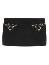 Black virgin wool miniskirt by Versace with decorated pockets Gender: Women Material: .100% VIRGIN WOOL Color: Black Made in: Italy Product ID: 1021777 1A12789 1B000 *Import tax/duty will be calculated at checkout (If applicable)