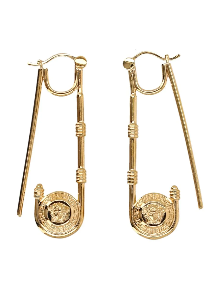 Safety pin earrings by Versace. Featuring: Safety pin drop earrings Hinge closure Medusa medallions with Greca engraving Lead and nickel-free Length: 5 cm Gender: Women Material: 100% METAL Color: Gold Made in: Italy Product ID: 25A10205661A00620#3J000 *Import tax/duty will be calculated at checkout (If applicable)