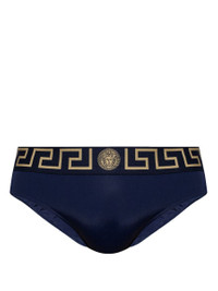 navy blue stretch-cotton Medusa Head motif signature Greca detailing elasticated logo waistband classic bottoms Be mindful to try on swimwear over your own garments. Gender: Men Material: NYLON 78% ; ELASTANE 22% Color: MULTICOLOR Made in: IT Product ID: ABU01025 1A11119 A70W *Import tax/duty will be calculated at checkout (If applicable)