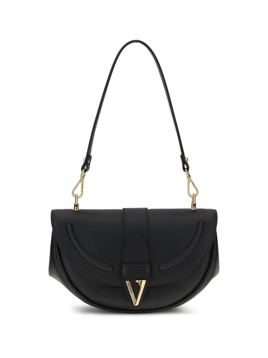 VERSACE'S MEDIUM VIRTUS SHOULDER BAG EMBODIES ELEGANCE AND CHARACTER WITH ITS ICONIC VERSACE LOGO-ENGRAVED V-SHAPED ATTACHMENT. EQUIPPED WITH A FRONT FLAP WITH MAGNETIC CLOSURE, IT FEATURES AN INTERIOR SLIP POCKET FOR ESSENTIALS. THE HANDLE AND SHOULDER STRAP, BOTH REMOVABLE AND THE SECOND ALSO ADJUSTABLE, OFFER VERSATILITY OF USE, MAKING THIS MODEL PERFECT FOR BOTH DAY AND EVENING. UNI Height: 18 cm, Length: 35 cm, Depth: 11 cm Gender: Women Material: CALF LEATHER BOS TAURUS Color: Black Made in: Italy Product ID: 10200881A16004_1B00V *Import tax/duty will be calculated at checkout (If applicable)