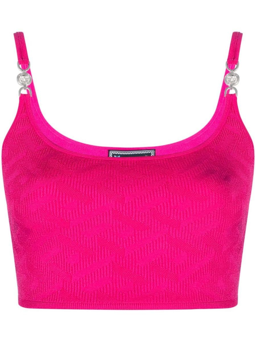 La Greca Medusa '95 knitted crop top from Versace featuring fuchsia pink, fine knit, signature Greca detailing, Medusa plaque detail, plunging U-neck, thin shoulder straps and cropped. Gender: Women Material: VISCOSE 92% POLYAMIDE 6% ELASTANE 2% Color: PINK Made in: IT Product ID: 1008789 1A08240 1PO30 *Import tax/duty will be calculated at checkout (If applicable)