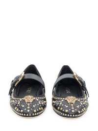 Black leather Versace ballerina decorated with gold and silver studs, embellished with Medusa detail on the toe. Gender: Women Material: OUTSIDE: 100% LEATHER, 100% FABRICLINING: 100% LEATHER, 100% FABRICSOLE: 100% LEATHER, 100% RUBBER Color: Black Made in: Italy Product ID: 10217101A16222 1B00O *Import tax/duty will be calculated at checkout (If applicable)