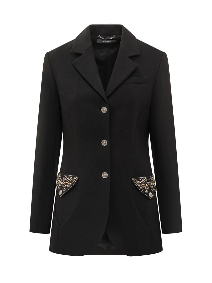 Black Versace blazer with logo buttons and pockets embellished with gold jewel applications. Gender: Women Material: OUTSIDE: 100% VIRGIN WOOL LINING: 100% CUPRO Color: Black Made in: Italy Product ID: 10221321A12789 1B000 *Import tax/duty will be calculated at checkout (If applicable)