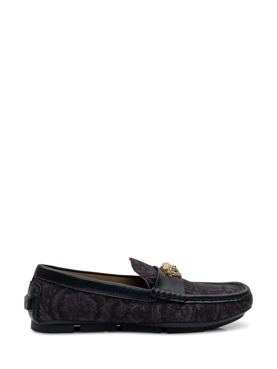 Versace men's driver loafers in baroque patterned fabric and black leather, embellished with the iconic gold Medusa detail. Gender: Men Material: OUTSIDE:100% LEATHER, 100% FABRICLINING:100% LEATHERSOLE:100% RUBBER Color: Black Made in: Italy Product ID: 10198821A15926 2BI8V *Import tax/duty will be calculated at checkout (If applicable)