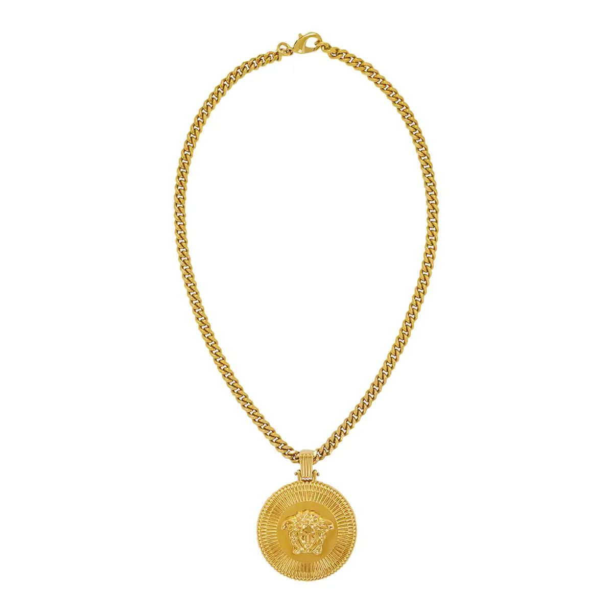 Gold-tone metal Medusa-pendant necklace from VERSACE featuring gold-tone hardware, curb chain, Medusa plaque detail and lobster claw fastening. Length when open: 70.0 Centimetres PENDANT LENGTH: 6.4 Centimetres PENDANT WIDTH: 4.9 Centimetres WIDTH: 0.7 Centimetres Gender: Men Material: 100% METALLIC FIBER Color: 3J000-VERSACE GOLD Made in: IT Product ID: 10053341A006203J000 *Import tax/duty will be calculated at checkout (If applicable)