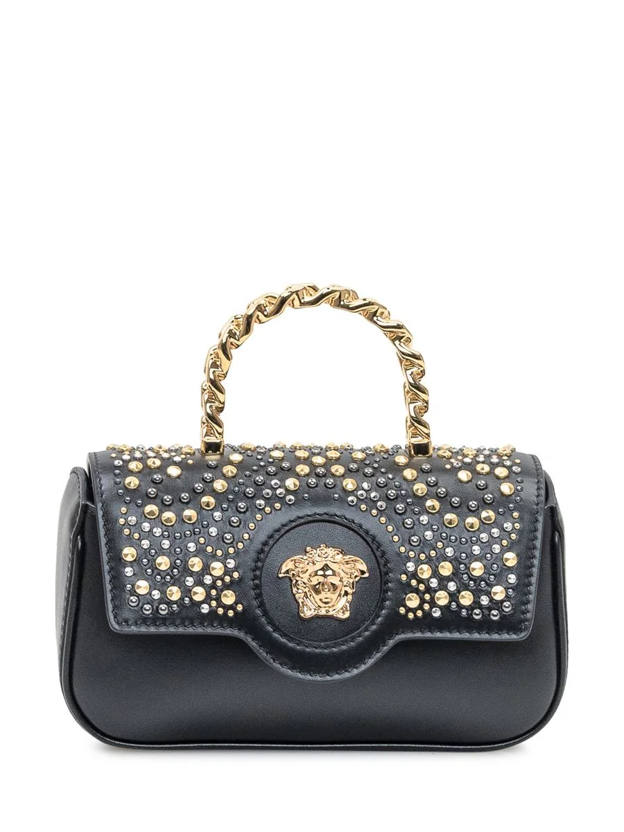 Black leather Versace Mini Top Handle bag with gold and silver studs, chain handle and iconic central Medusa. Width: 19.5Height: 11.5Depth: 5 Gender: Women Material: 100% LEATHER Color: Black Made in: Italy Product ID: 10134391A16216 1B00O *Import tax/duty will be calculated at checkout (If applicable)