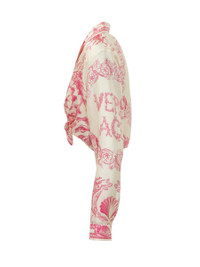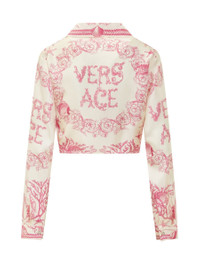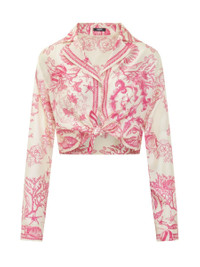 Versace satin crop shirt with navy baroque print in pink hue, classic collar, long sleeves and front knot. Gender: Women Material: 100% SILK Color: RED Made in: Italy Product ID: 10203071A15277 5K660 *Import tax/duty will be calculated at checkout (If applicable)