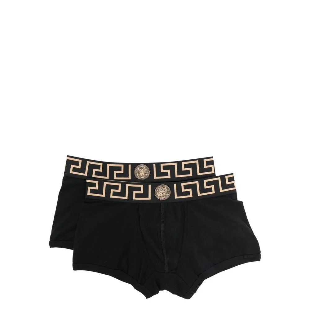 Black/gold-tone stretch-cotton lightweight jersey elasticated logo waistband medusa head motif slip-on style just a reminder that this piece must be tried on over your own garments. Gender: Men Material: COTTON: 94.0%, SPANDEX/ELASTANE: 6.0% Color: Black Made in: BA Product ID: 1A10011 AU10181 A80G *Import tax/duty will be calculated at checkout (If applicable)