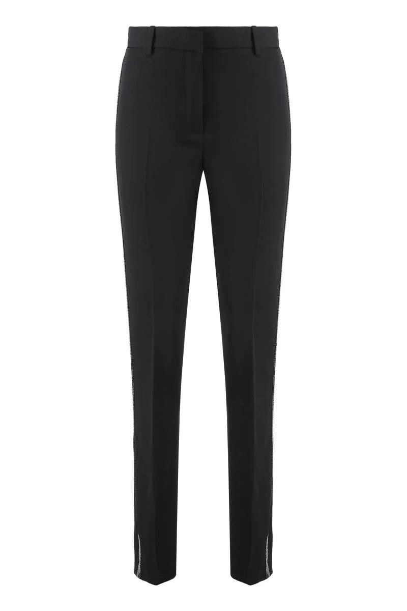 Wool tailored trousers Contrasting color side stripes Two back buttoned welt pockets 100% Virgin wool, 100% Metal, 100% Cuprammonium rayon Gender: Women Material: VIRGIN WOOL Color: Black Made in: Italy Product ID: 10201291A14592_1B000 *Import tax/duty will be calculated at checkout (If applicable)