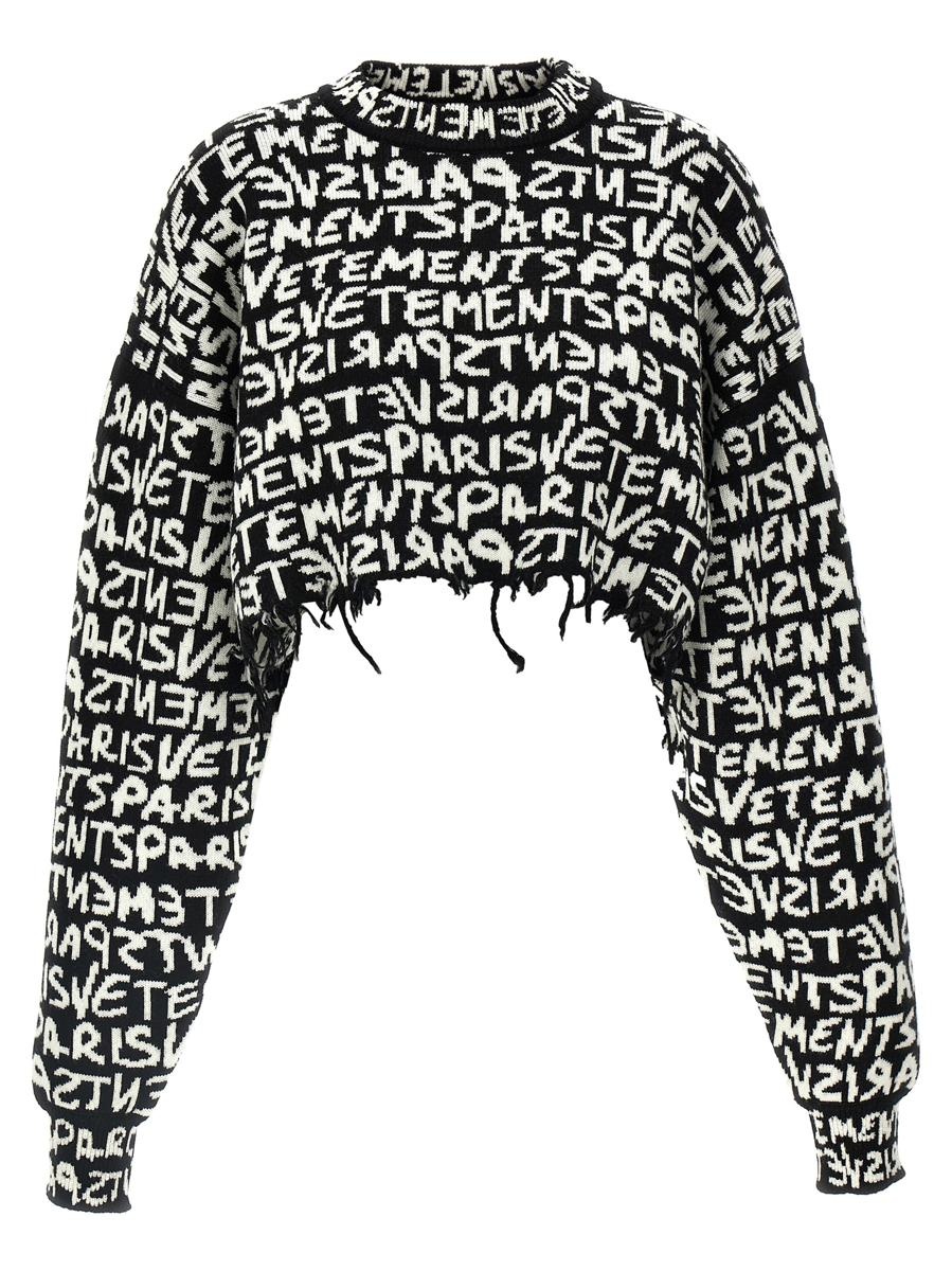 'Vetements Paris Monogram' cropped wool knit sweater with all-over jacquard logo, crew neck, long cuffed sleeves, frayed hem Gender: Women Material: 100% MERINO WOOL Color: Multicolor Made in: IT Product ID: WA65KN314BBLACKWHITE *Import tax/duty will be calculated at checkout (If applicable)