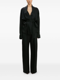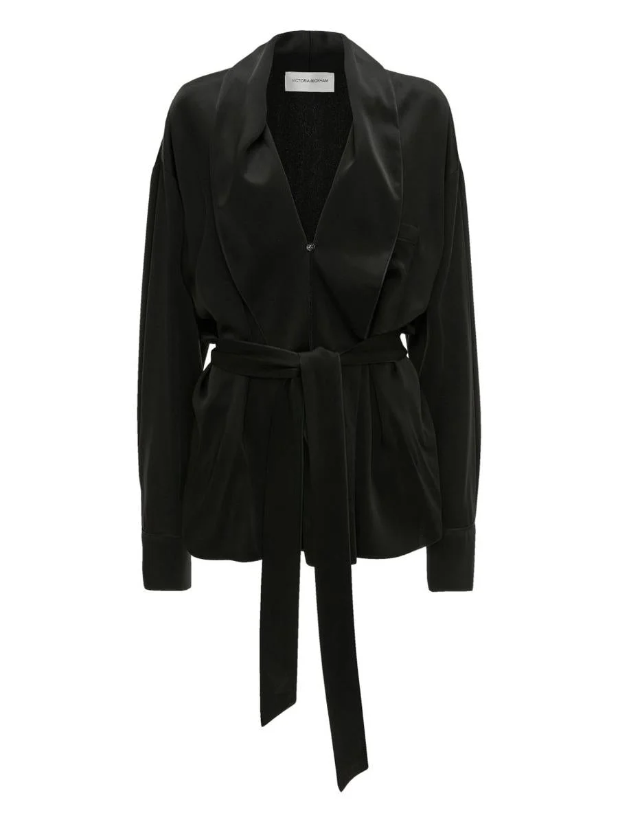 Front button closure Shawl collar; long sleeves, dropped shoulders, buttoned cuffs Patch pocket at chest Matching adjustable and detachable wrap belt at the waist Tone-on-tone piping detail at cuffs, pocket edge, and belt Oversized fit Black color 71% Acetate, 29% Viscose Made in Portugal Gender: Women Material: 71% ACETATE, 29% VISCOSE Color: Black Made in: Portugal Product ID: 1425WSH006839BBLACK *Import tax/duty will be calculated at checkout (If applicable)
