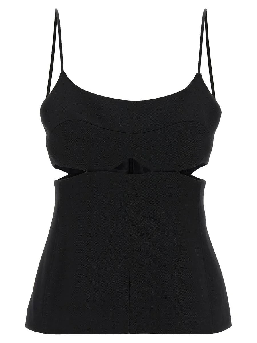 'Cut-Out Cami' Grain Depoudre blend top with balloon neckline at the front and back, bra stitching on the chest, cut-out details at the waist, thin straps, back zip closure Gender: Women Material: 55% POLYESTER, 45% VIRGIN WOOL Color: Black Made in: Imported Product ID: 1125WTP006159ABLACK *Import tax/duty will be calculated at checkout (If applicable)