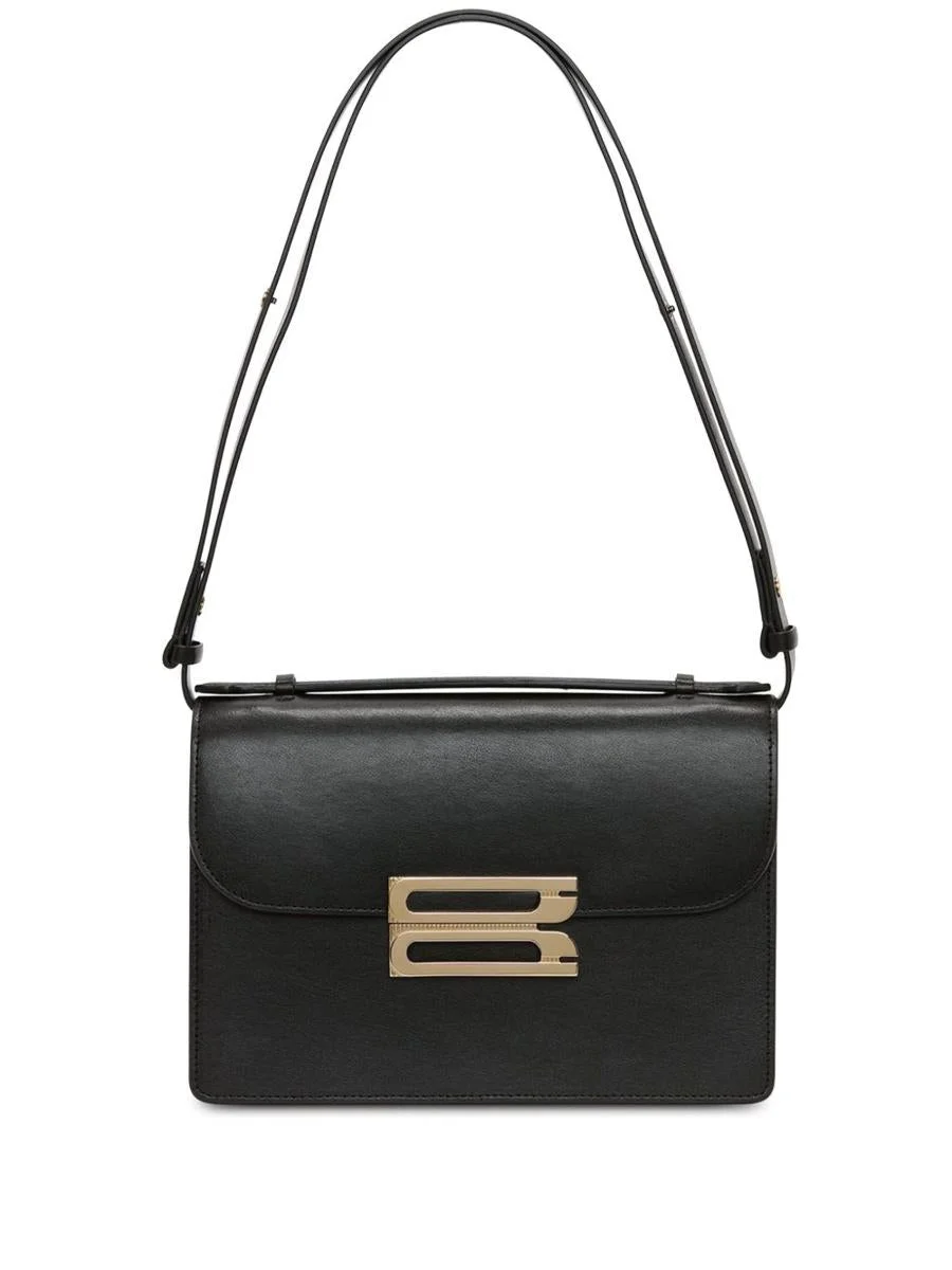Victoria Beckham Black Logo Plaque Shoulder Bag SizeAndFit: Depth 8 cm Handle 4 cm Height 12 cm Width 20 cm Gender: Women Material: .100% CALF LEATHER Color: Black Made in: Italy Product ID: B125AAC006211A BLK *Import tax/duty will be calculated at checkout (If applicable)