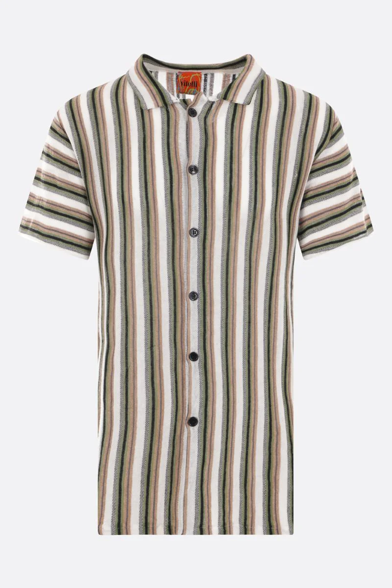Vitelli's short-sleeved shirt crafted in white / green / beige striped cotton, linen and wool knit. Featuring classic collar, button closure and straight hem. Gender: Men Material: 50% LINEN, 30% COTTON, 20% WOOL Color: WHITE+GREEN Made in: IT Product ID: PS224VIT001J14 *Import tax/duty will be calculated at checkout (If applicable)