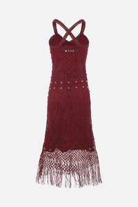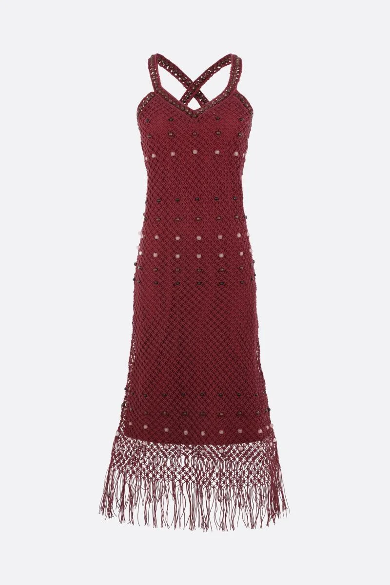 Wales Bonner's midi dress crafted in burgundy cotton macrame hand-embroidered with Ghanaian wood and African recycled glass beads. Featuring band straps crossed at back, hook-and-eye / button closure along side and fringes at hem. Removable matching petticoat. The garment belongs to the Spring Summer 2023 Horizon Blues collection, characterized by eco-sustainable and ethically valuable artisanal processes and raw materials. Gender: Women Material: FABRIC 1: 100% WAXED COTTON YARN / TRIMS: 100% RECYCLED GLASS BEADS, 100% WOOD BEADS Color: OXBLOOD Made in: IN Product ID: WS23DR07CO16350 *Import tax/duty will be calculated at checkout (If applicable)