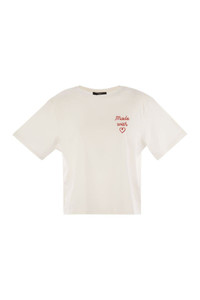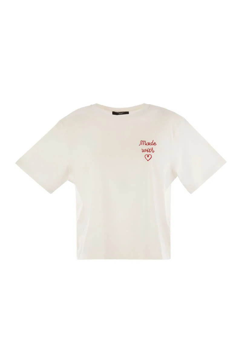 Basic T-shirt in pure organic cotton jersey, customised with all over print motif and embroidery on chest. - Logo on the back under the neck - Boxy fit - Ribbed crew neck - Short sleeves with dropped shoulder DESIGNER ID: 2525976051600 003 Gender: Women Material: 100% COTTON Color: WHITE Made in: Italy Product ID: 2525976051600 003 *Import tax/duty will be calculated at checkout (If applicable)