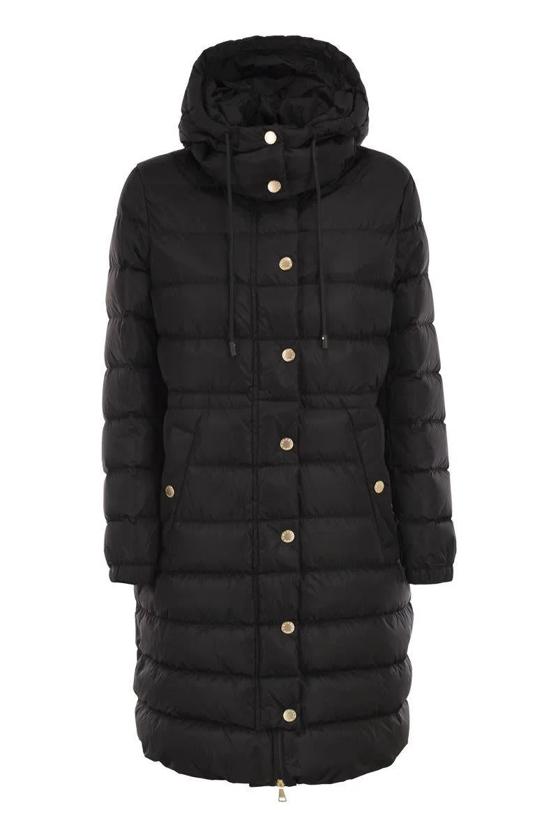 Single-breasted midi down jacket in water-repellent nylon taffeta with horizontal quilted pattern. - Slim fit with adjustable drawstring waist - High collar with detachable hood - Long sleeves with elasticated cuffs - Concealed zip fastening and press studs - Slash pockets on the sides - Goose down padding DESIGNER ID: 2525496052600 004 Gender: Women Material: 100% POLYAMIDE LINING: 100% POLYAMIDE Color: Black Made in: Imported Product ID: 2525496052600 004 *Import tax/duty will be calculated at checkout (If applicable)