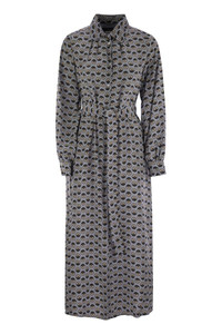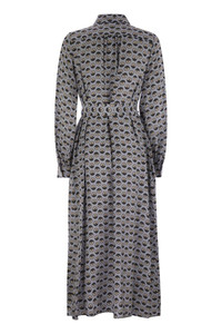 Long printed pure silk crepe de Chine chemisier dress with matching belt to tie at the waist. - Fluid silhouette with ample and feminine volume - Shirt collar and cuffs - Long balloon sleeves - Front button fastening - Hip pockets - Unlined DESIGNER ID: 2525226091600 002 Gender: Women Material: 100% SILK Color: Blue Made in: Italy Product ID: 2525226091600 002 *Import tax/duty will be calculated at checkout (If applicable)