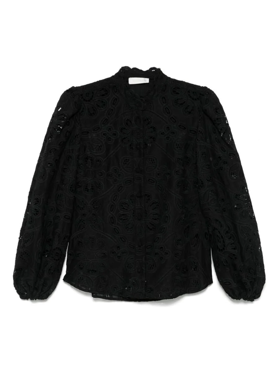 The 'Rhiannon' blouse by Zimmermann is a refined piece with a romantic and decisive tone, in black, it stands out for its embroidered design and long balloon sleeves that give volume and elegance, the front closure with buttoning adds a classic touch, making it perfect to combine with skirts or tailored trousers for a refined look - Zimmermann - 'Rhiannon' Blouse - Black - Fabric with decorative embroidery - Front closure with buttons Gender: Women Material: .100% POLYESTER Color: Black Made in: Imported Product ID: 4253TSS251 BLK *Import tax/duty will be calculated at checkout (If applicable)