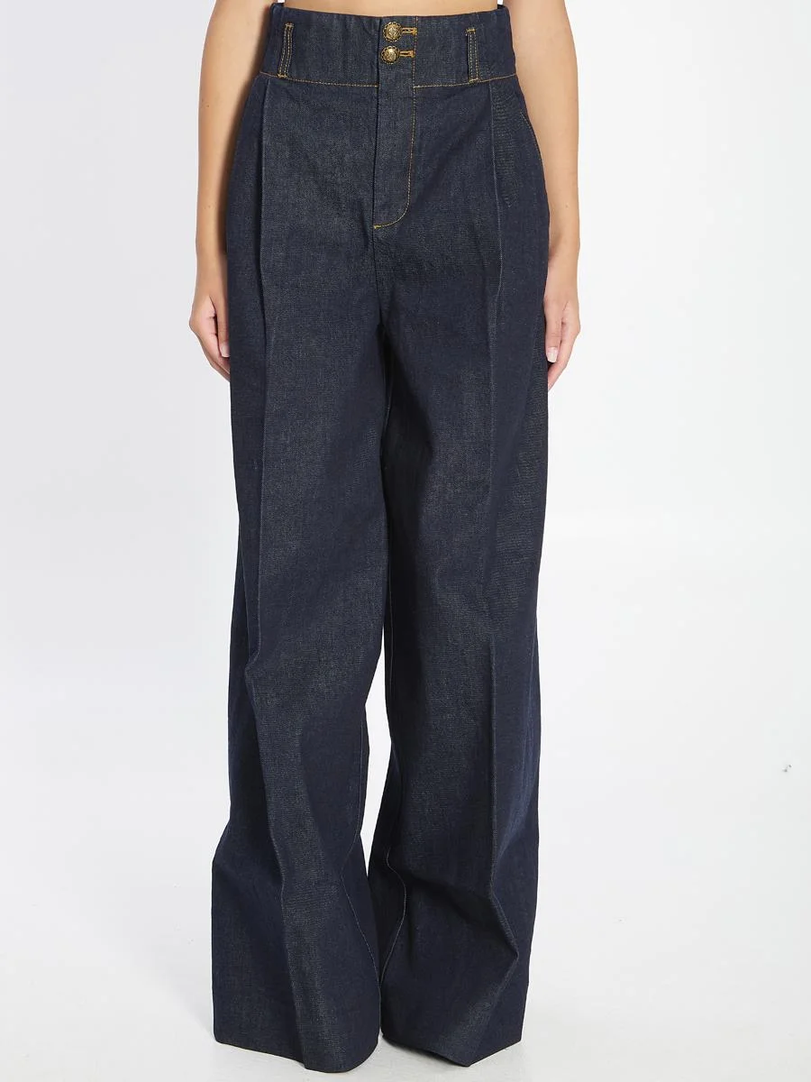 "Night Sky" blue denim trousers. Features high waist with wide waistband, belt loops, front zip and gold button closure, two slant front pockets and two back welt pockets with buttons, crease effect, and full-length leg. Regular fit. The model is 178 cm tall and wears size 0 US. Size nationality: US Gender: Women Material: 75% COTTON, 25% VISCOSE; LINING: 86% POLYESTER, 14% COTTON Color: BLUE Made in: Imported Product ID: 1194217 6174PF251 NHTSKY *Import tax/duty will be calculated at checkout (If applicable)