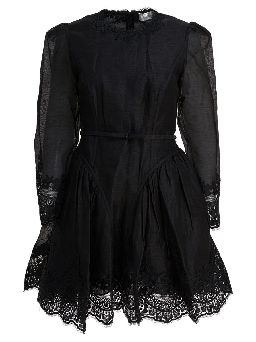Hypnotic lace mini dress Zimmermann made of silk and linen. The construction features a flared silhouette, defined by a wide skirt enriched with tulle inserts that add volume. The garment features a rounded neckline, long sleeves with gathered shoulders and lace trim applied to the neckline, cuffs and hem. Back closure with invisible zipper and inner lining. Removable belt with matching bow. || - Solid color - Flared - Long sleeves - Lace details on neckline, cuffs and hemline - Tulle inserts in skirt - Removable belt with bow - Gathered shoulders - Invisible back zipper closure - Lined garment - Composition: 53% linen, 47% silk - Regular fit Extra Description: Solid colourRegular fit;Flared;Long sleeves Gender: Women Material: 53% LINEN 47% SILK Color: Black Made in: Imported Product ID: 5241DF251BLK *Import tax/duty will be calculated at checkout (If applicable)