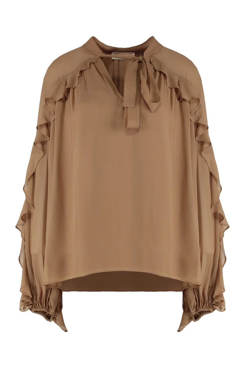 Illuminate crepe blouse Ruffled item Elastic cuffs Zimmermann size guide: 0P = 38P IT 0 = 40 IT 1 = 42 IT 2 = 44 IT 3 = 46 IT 4 = 48 IT 100% Viscose Gender: Women Material: VISCOSE Color: Brown Made in: Imported Product ID: 4101TS251_TAN *Import tax/duty will be calculated at checkout (If applicable)