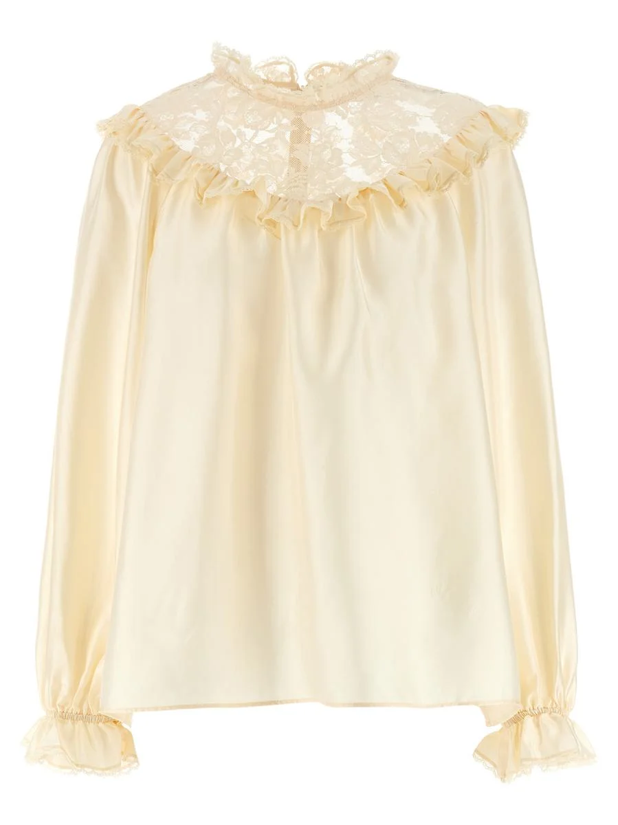 'Lace Billow' silk blouse with ruffled lace top, high neck, back zip closure, long puff sleeves with elastic ruffle cuffs Gender: Women Material: 100% SILK Color: Beige Made in: Imported Product ID: 5070TF25RCRM *Import tax/duty will be calculated at checkout (If applicable)