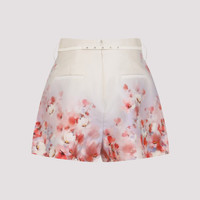 Zimmermann Scarlet Floral Multicolor Silk Crush Flat Front Short. Crafted in silk and cotton. High-waist, back zipped fastening, white adjustable belt, front metallic floral buckle with crystal details, front pleated details, back slit pockets, straight hem. White background with multicolor floral design. Gender: Women Material: 53%SILK 47%COTTON Color: MULTICOLOUR Made in: IMPORTED Product ID: 2355AR251_ *Import tax/duty will be calculated at checkout (If applicable)