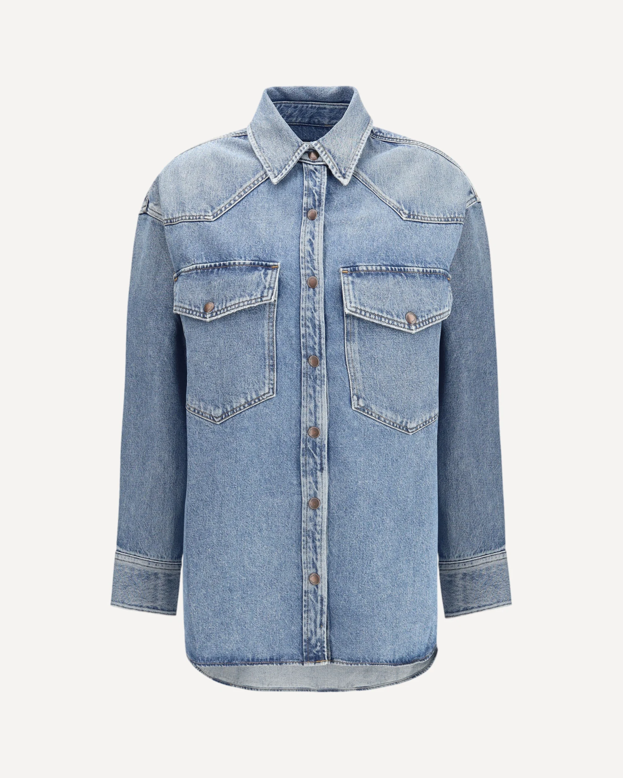 The Lotta Shirt by Agolde is a structured denim essential inspired by classic Western styling. Crafted from rigid regenerative cotton in a medium indigo wash, it features a pointed yoke, snap button closure, and flap chest pockets. The non-stretch denim offers a clean, heritage look with a soft feel for all-day comfort. Perfect worn open over a tee or buttoned-up for a refined take on classic denim. DETAILS - Sku: A7357B1463_GAD - Season: SS26 - Fit: Regular - Composition: GENERAL 75% Recycled Cotton 25% Lyocell - MADE IN TURKEY