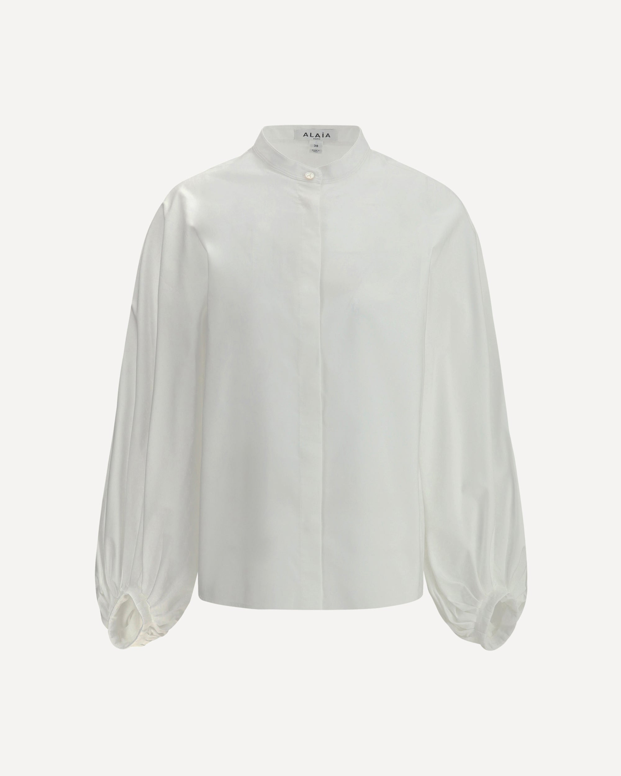 The Balloon Shirt by Alaia features a sleek mandarin collar and a concealed button front closure for a clean, sophisticated look. The balloon sleeves add volume and sophistication, creating a draped effect that flatters the silhouette. The design, which combines modern and classic elements, makes this shirt a distinctive and trendy piece, ideal for those seeking a chic yet original look. DETAILS sku AA9C0977T611A_000 composition: COTTON 100% color group: WHITE gender: WOMAN season: SS25 size chart: RTW FR category name: SHIRTS