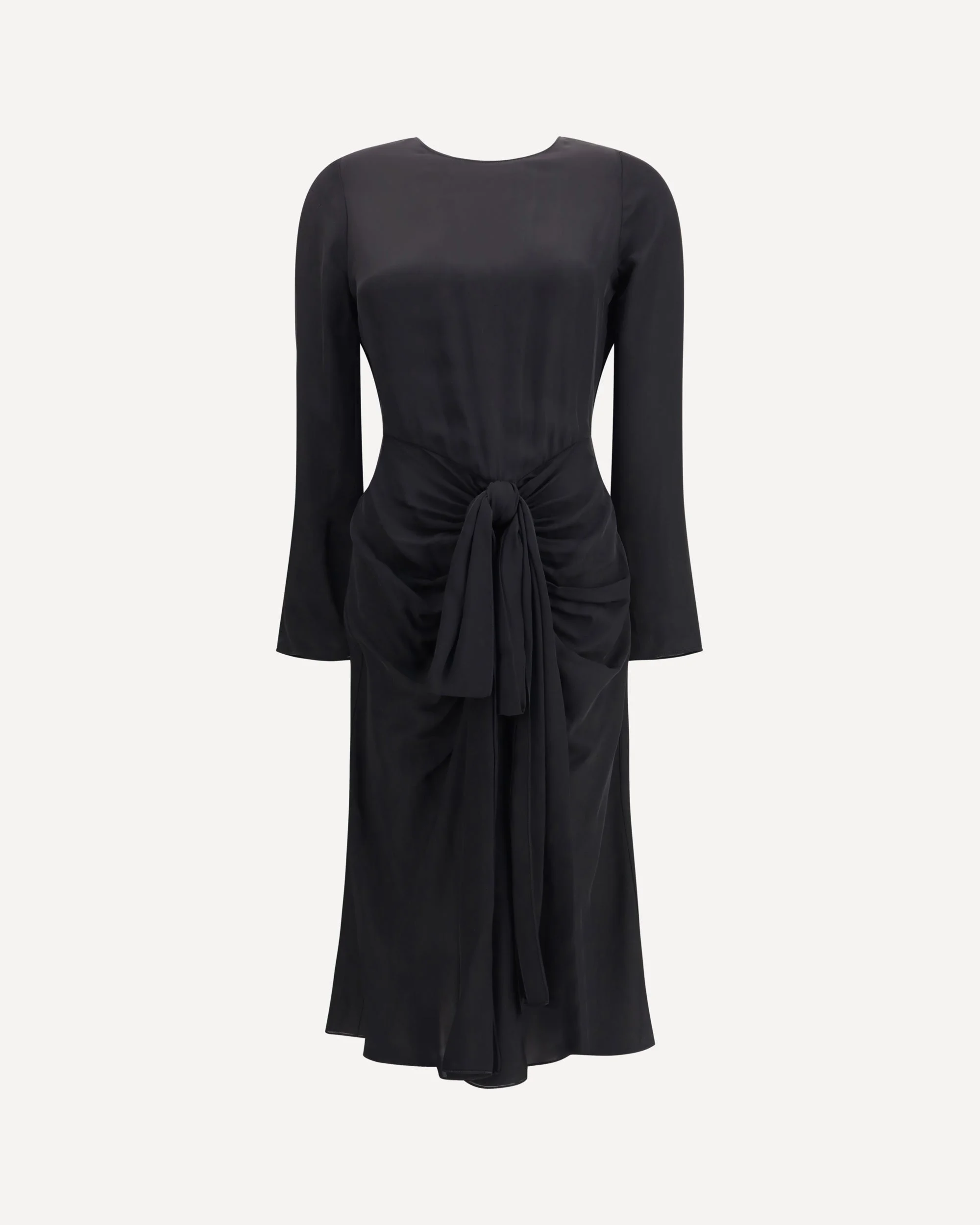The Draped Viscose Dress by Alaia embodies femininity and movement through fluid lines and refined details. This midi silhouette with long sleeves is enriched by a side bow at the waist, creating an elegant draped effect that enhances volume and highlights the sophistication of the fabric. DETAILS - Sku: AA9R2811W096B_995 - Season: AW25 - Fit: Regular - Composition: GENERAL 100% Viscose - MADE IN ITALY