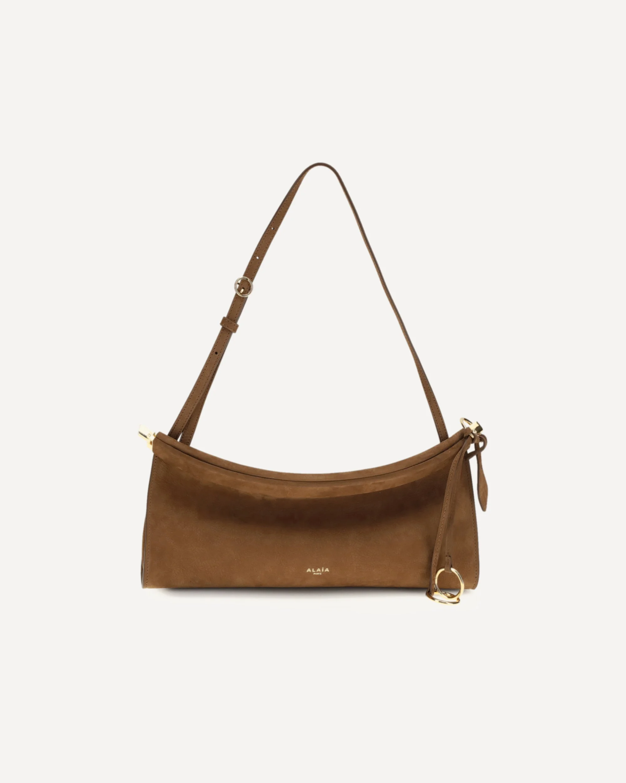 The East West Shoulder Bag by Alaia is distinguished by its curved silhouette, designed to gently hug the line of the body. Elegant and contemporary, it features a leather-covered zipper top opening that enhances its refined design. The iconic pleat detail at the bottom adds structure and personality, while decorative laces with metal rings complete the aesthetic with a graphic touch. Wear it on the shoulder or cross-body thanks to the adjustable shoulder strap, it is the perfect accessory for sophisticated, modern style. DETAILS - Sku: AA1S01430CA214_731 - Season: SS26 - Dimension: 30x30x9 - Composition: GENERAL 100% Calf Leather Bos Taurus - MADE IN ITALY