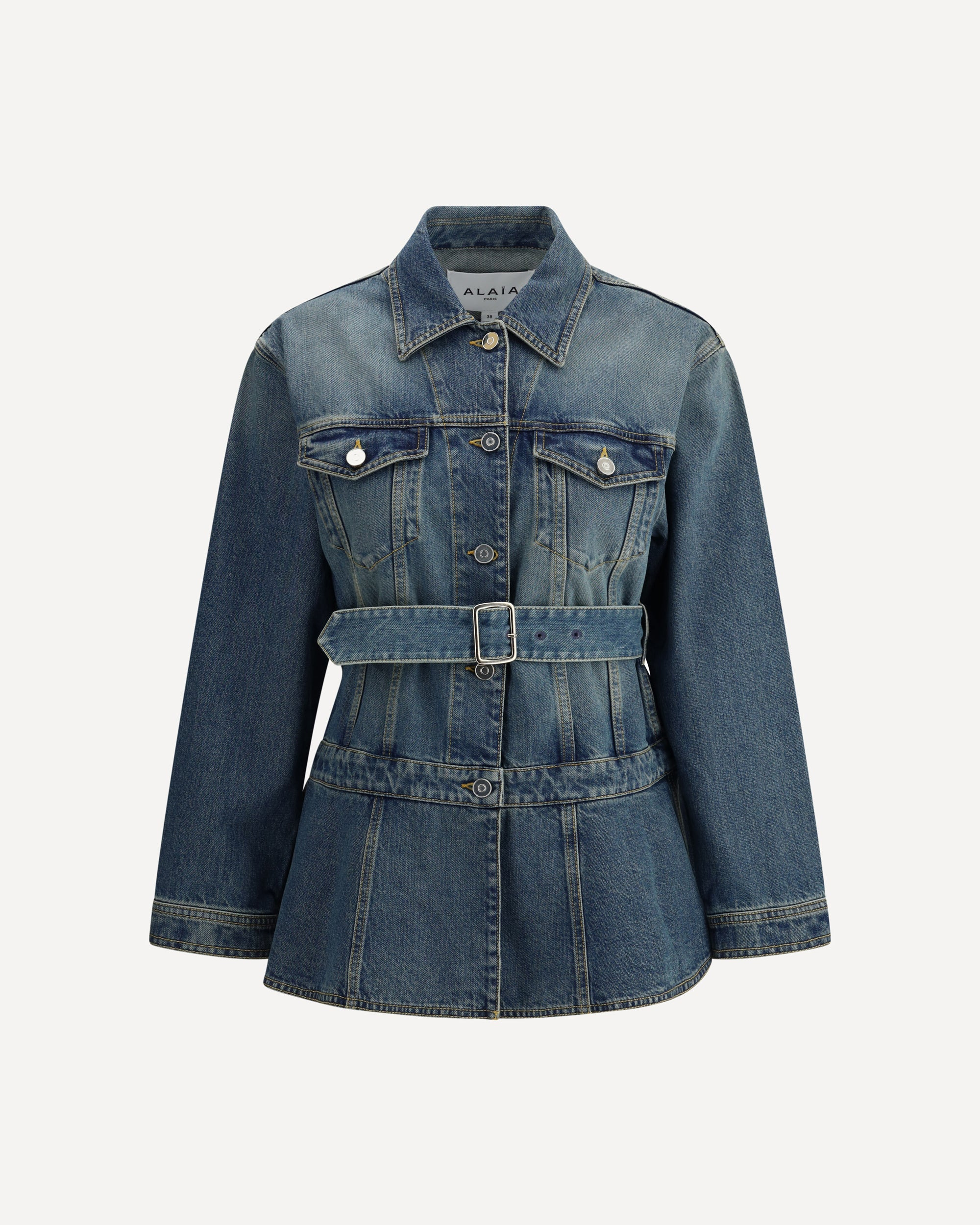 The Alaia peplum Denim Jacket is a sleek piece with a distinctive design. Featuring a classic collar, it has a front button fastening and two front patch pockets with buttons, which add a touch of functionality. Belt loops at the waist and a matching belt, adjustable with a buckle and removable, allow you to personalize the fit. The peplum hem adds a feminine and sophisticated detail, making this jacket a versatile and classy piece. DETAILS sku AA9V0422T536A_525 composition: COTTON 99% POLYURETHANE 1% color group: BLUE gender: WOMAN season: SS25 size chart: RTW FR category name: JACKETS