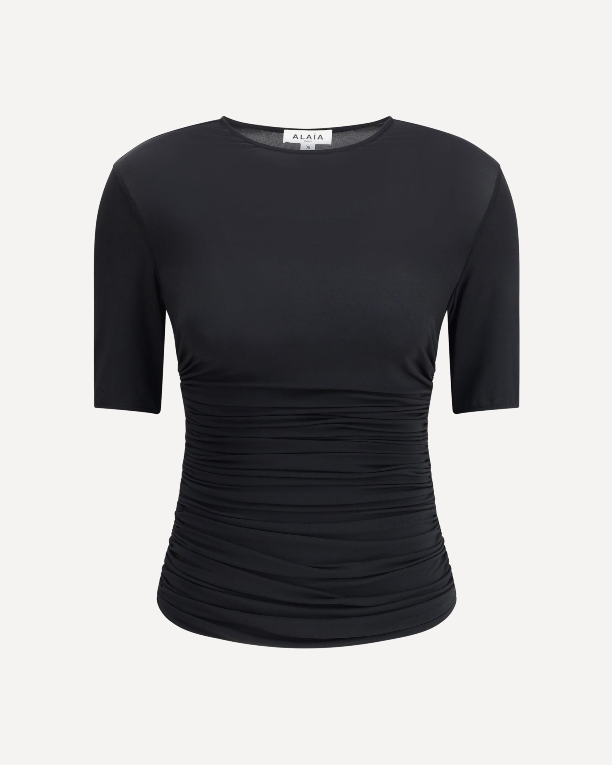 Alaia's soft jersey pleated T-Shirt combines comfort and style with a refined design. It features a classic crew neck, short sleeves and gathered details at the waist that give movement and definition to the silhouette, making it perfect for an elegant yet casual look. DETAILS - Sku: AA9H1248J050B_995 - Season: AW25 - Fit: Slim - Composition: GENERAL 96% Viscose 4% Elastane - MADE IN ITALY