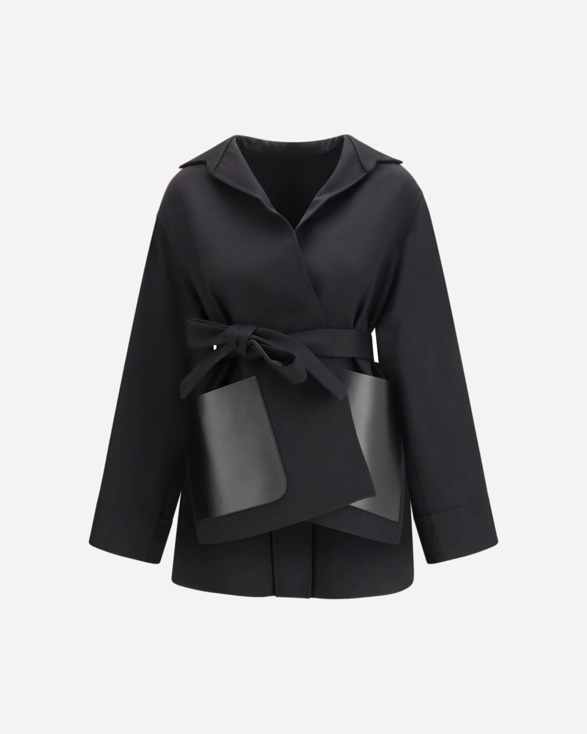 The wrap tailored wool Jacket by Alaia reinterprets sartorial elegance through a contemporary lens. Crafted from tailored wool, it features a regular fit with a classic collar and dropped shoulders, creating a balanced, modern silhouette. Leather patch pockets add a distinctive detail, while the placket neckline, button fastening and wrap closure structure the design. A leather patch at the back serves as a belt loop, finished with a straight hem and full lining. DETAILS - Sku: AA9V1250W130C_995 - Season: SS26 - Fit: Regular - Composition: GENERAL 100% Fleece Wool - MADE IN ITALY