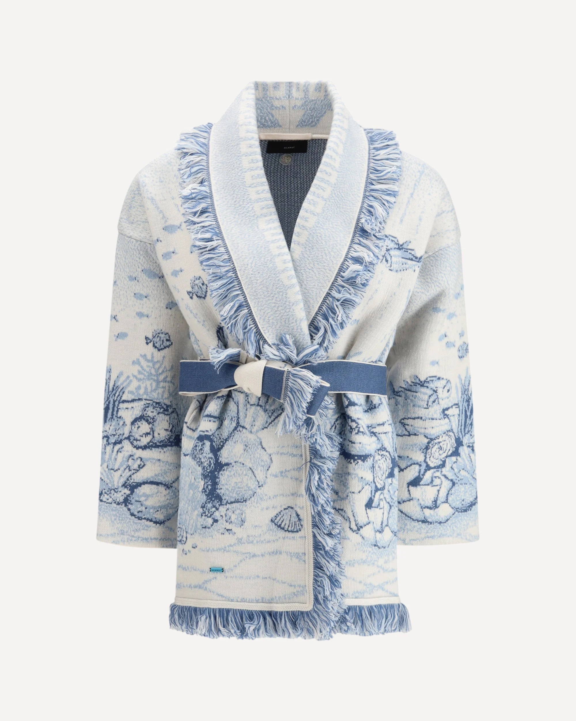 The Deep In The Ocean Cardigan in wool blend by Alanui reflects the brand’s idea of turning this piece into a canvas for artistic expression. The jacquard workmanship adds richness and texture, enhanced by fringed edges that embody Alanui’s iconic style. The removable belt allows easy adjustment of the silhouette, while the side pockets add subtle functionality. Made in Italy and accompanied by a garment bag, the Cardigan presents a refined yet relaxed aesthetic rooted in artisanal craftsmanship. DETAILS - Sku: LWHB064R26KNI018_0F45 - Season: SS26 - Fit: Regular - Composition: GENERAL 92% Wool 8% Polyamide - MADE IN ITALY